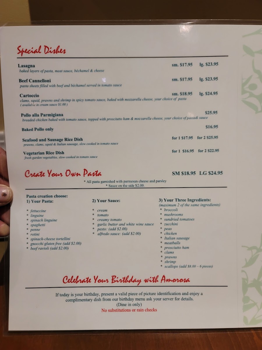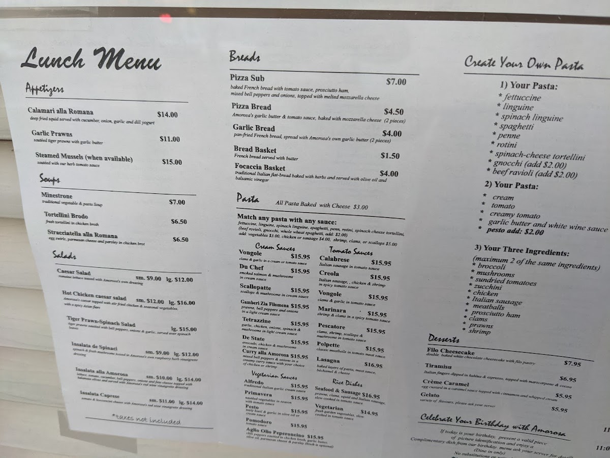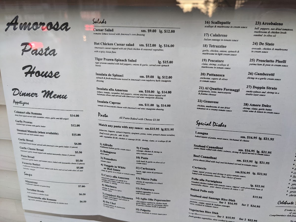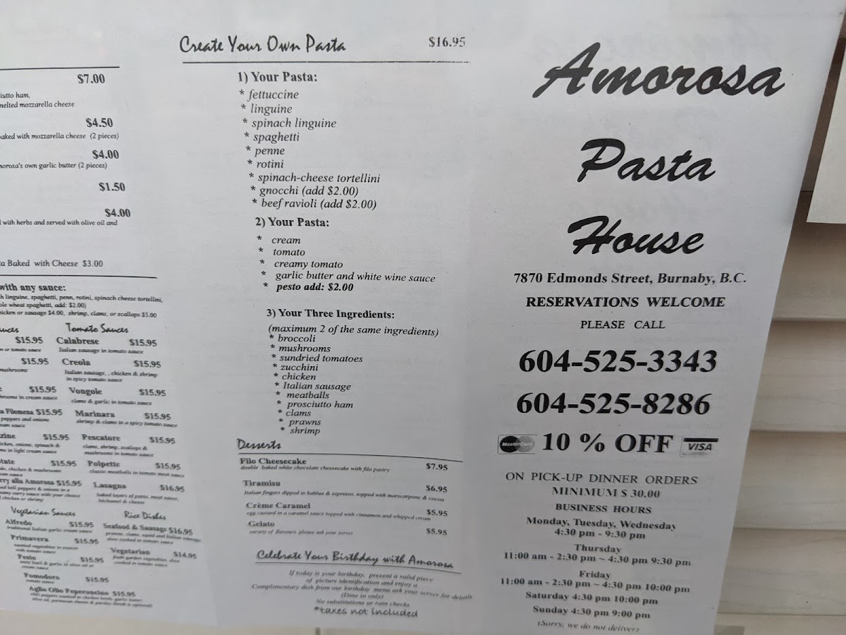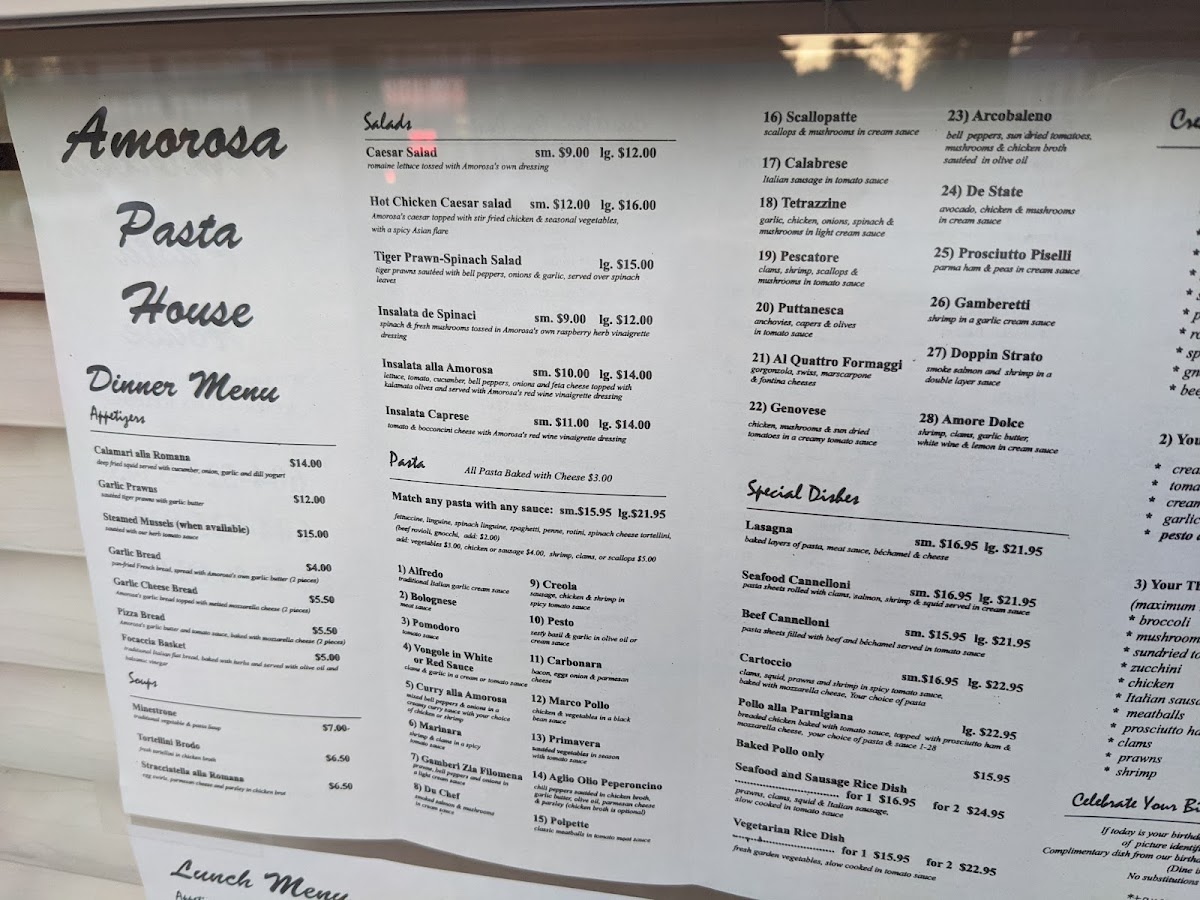 Welcome to Amorosa Pasta House, a charming Italian restaurant nestled in the heart of Burnaby, BC. Located at 7870 Edmonds St, Amorosa has become a beloved local favorite over the past 32 years, inviting guests into a warm and welcoming atmosphere perfect for both casual dining and special celebrations.